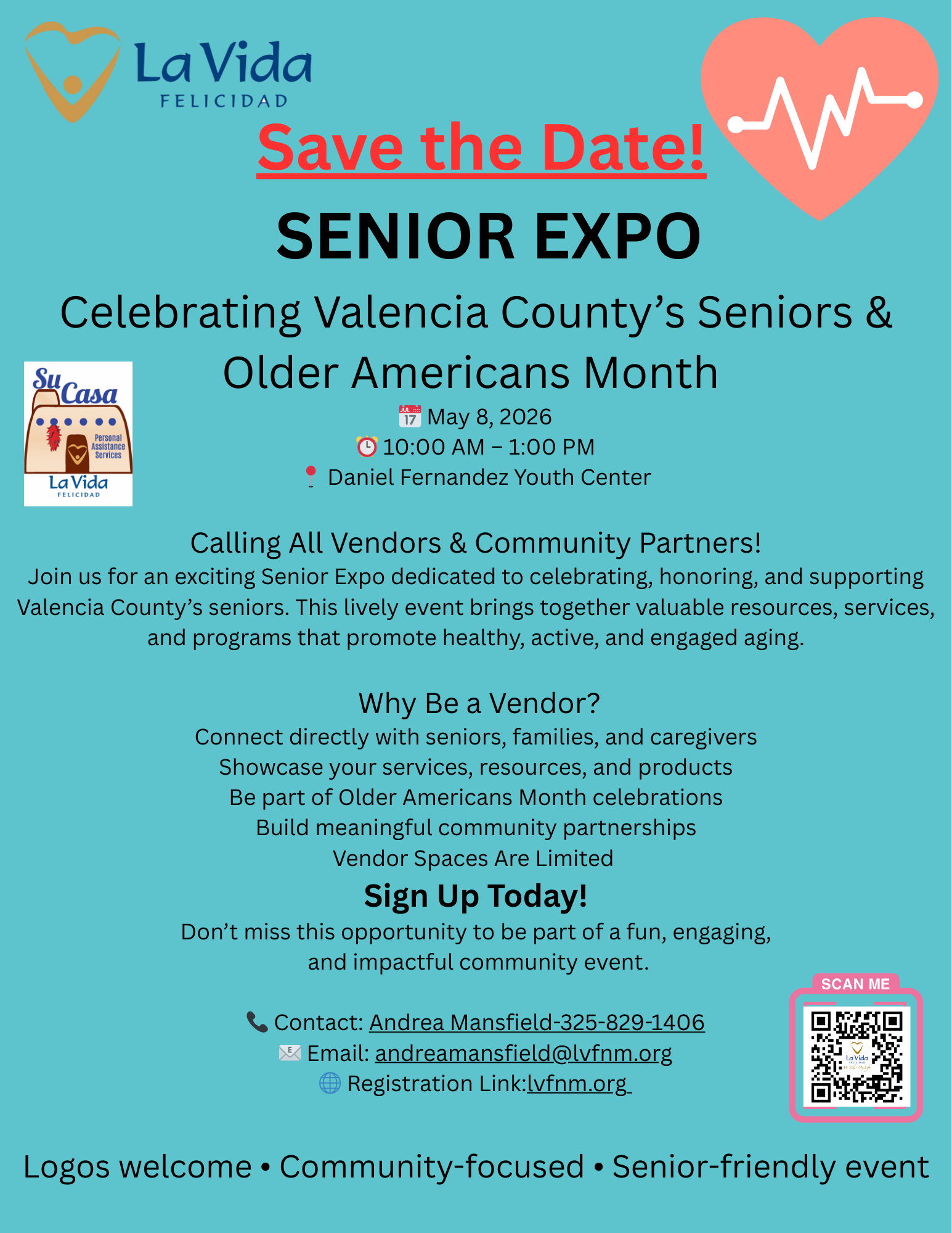 Welcome to the Senior Expo Vendor Registration event! Join us at the Daniel Fernandez Youth Center on May 8, 2026 at 10:00 AM (Mountain Time) for a day filled with networking and showcasing your products and services to our senior community. Don’t miss out on this opportunity to connect with potential customers and partners. Register now to secure your spot!